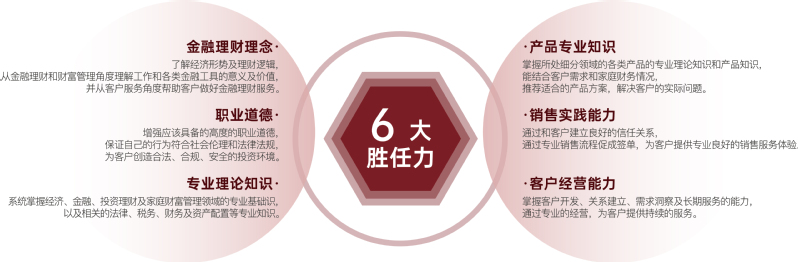 围绕金融从业人员的工作职责和服务范围,设定六项胜任力,并以此为基础设定目标和课程。