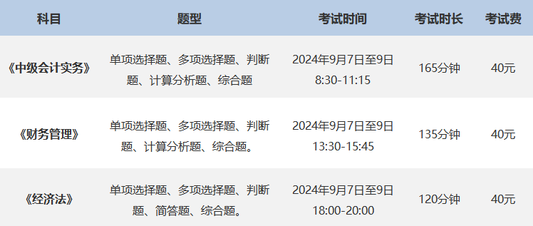 会计中级资格考试科目包括《中级会计实务》《财务管理》《经济法》。报名费10元/人。